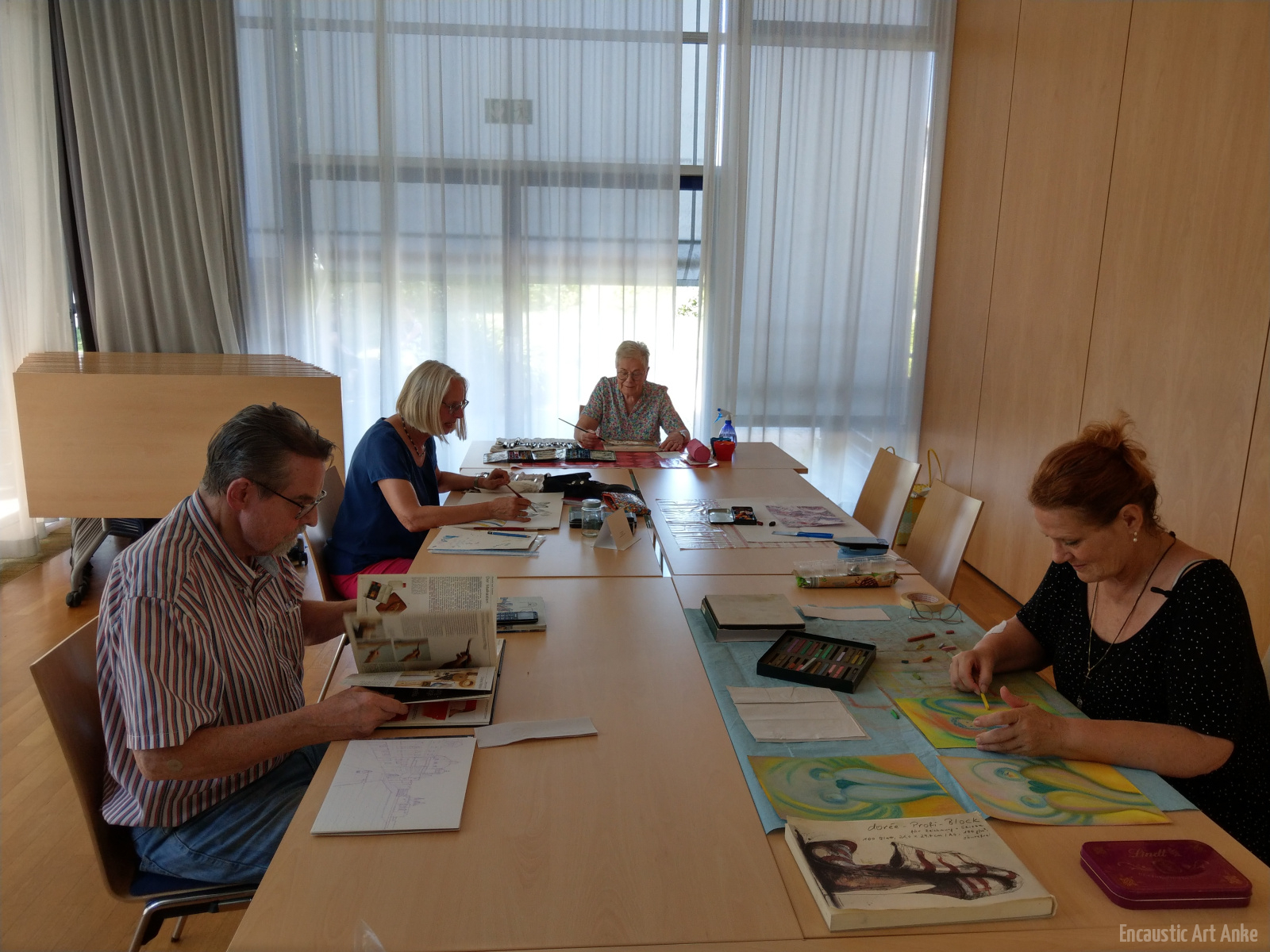 Seit Juli 2023 darf ich bei den Montagsmalern mitwirken. Das heißt, montags von 14 – 16 Uhr trifft sich eine Gruppe von Frauen und einem Mann, um nach Lust und Laune zu malen. Jede/r verwendet die Technik, die ihr/ihm liegt und gefällt. Wir unterstützen uns gegenseitig und tauschen uns aus, sei es kreativer oder alltäglicher Natur. Darauf freue ich mich jede Woche!