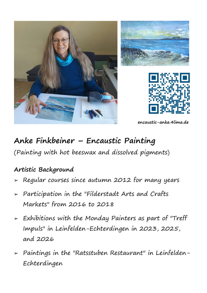 Since then, I have repeatedly attended courses over the years and painted with great enthusiasm. Soon, I also started looking for books, DVDs, and videos on the subject online. What countless possibilities opened up for me! Over time, I became bolder and tried new things, developing my own style. I now experience nature and my surroundings in a completely new and different way. I look at these from the perspective of painting and how I can implement them with encaustic.