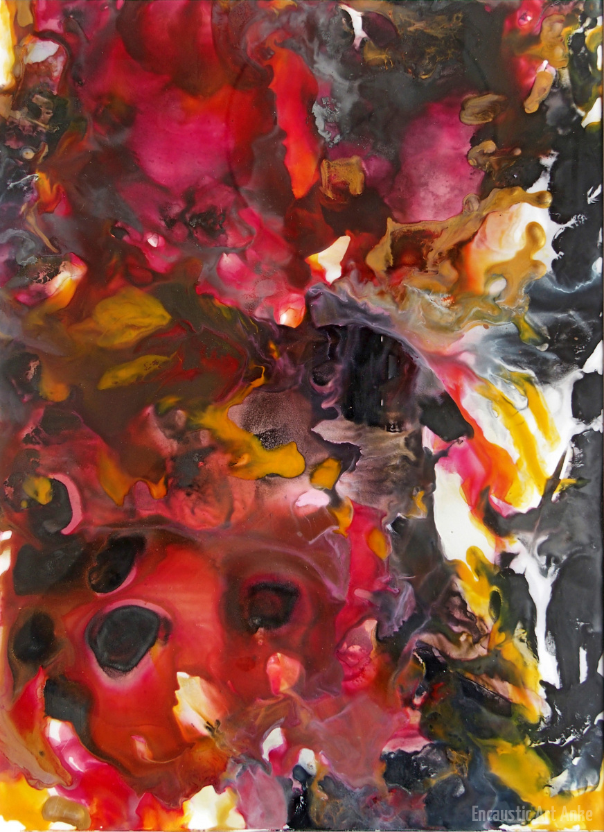 Eine ganz andere Gestaltung geht mit Hilfe eines Heißluftföhns. Auf speziell verdichtetem Malkarton wird zuerst flächig Klarwachs aufgetragen und dann mit dem Maleisen verflüssigtes Wachs aufgetropft. Danach entstehen durch das Föhnen der Farbtropfen einzigartige Bilder.