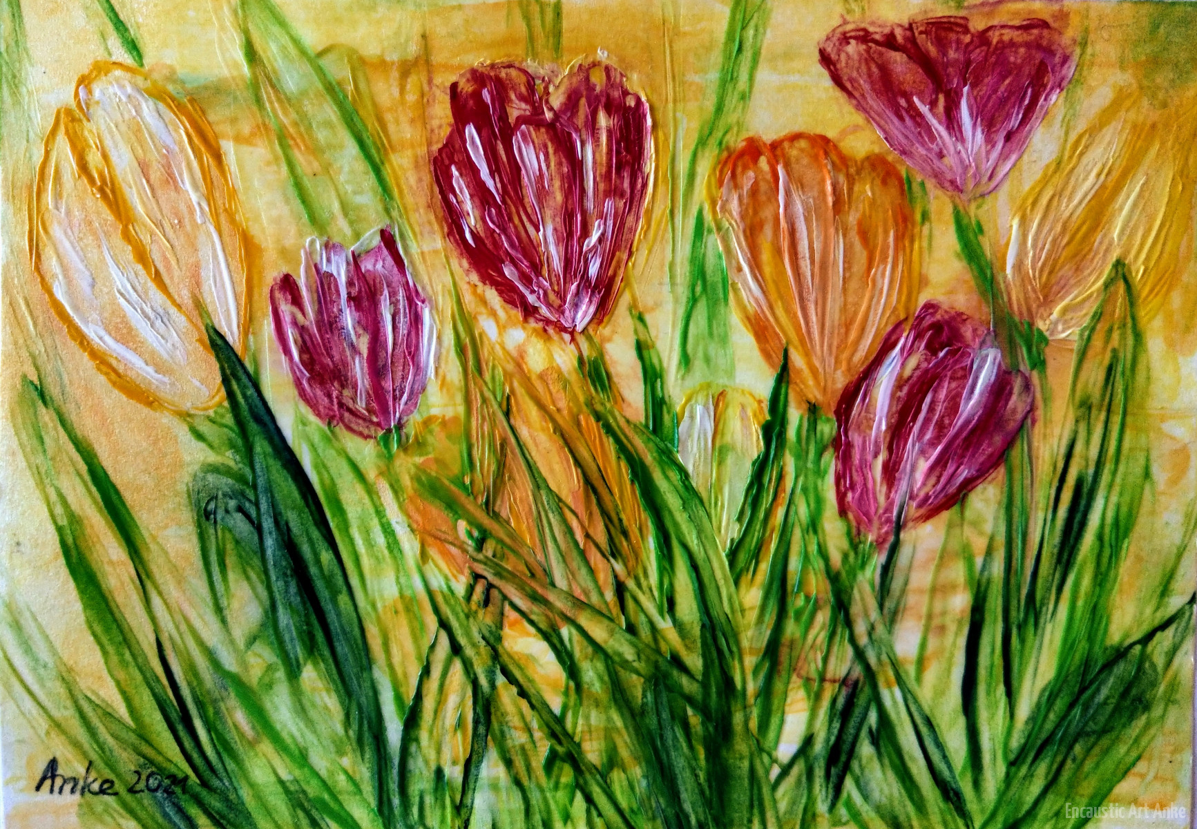 Unter Verwendung von Tissue (z. B. eine Lage einer Papierserviette) usw. lassen sich herrliche Hintergründe gestalten, indem nach einem allgemeinen Farbauftrag mit Klarwachs ein Stück hiervon „aufgeklebt“ wird. Es entstehen zarte, fließende Farbflächen, auf denen mit direktem Malen das weitere Bild gestaltet werden kann. Wird die Auflage geknüllt und wieder lose aufgezogen auf den Untergrund aufgebügelt, entstehen hierdurch interessante Effekte.