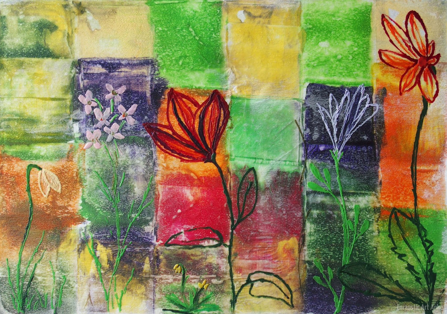 Unter Verwendung von Tissue (z. B. eine Lage einer Papierserviette) usw. lassen sich herrliche Hintergründe gestalten, indem nach einem allgemeinen Farbauftrag mit Klarwachs ein Stück hiervon „aufgeklebt“ wird. Es entstehen zarte, fließende Farbflächen, auf denen mit direktem Malen das weitere Bild gestaltet werden kann. Wird die Auflage geknüllt und wieder lose aufgezogen auf den Untergrund aufgebügelt, entstehen hierdurch interessante Effekte.
