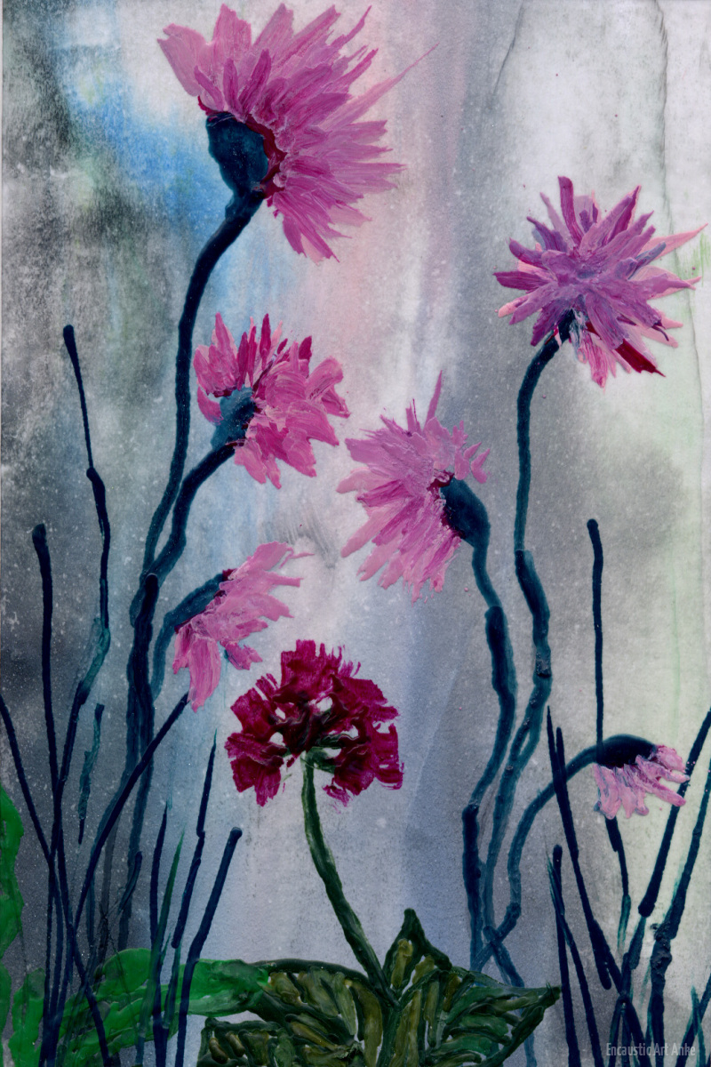Unter Verwendung von Tissue (z. B. eine Lage einer Papierserviette) usw. lassen sich herrliche Hintergründe gestalten, indem nach einem allgemeinen Farbauftrag mit Klarwachs ein Stück hiervon „aufgeklebt“ wird. Es entstehen zarte, fließende Farbflächen, auf denen mit direktem Malen das weitere Bild gestaltet werden kann. Wird die Auflage geknüllt und wieder lose aufgezogen auf den Untergrund aufgebügelt, entstehen hierdurch interessante Effekte.