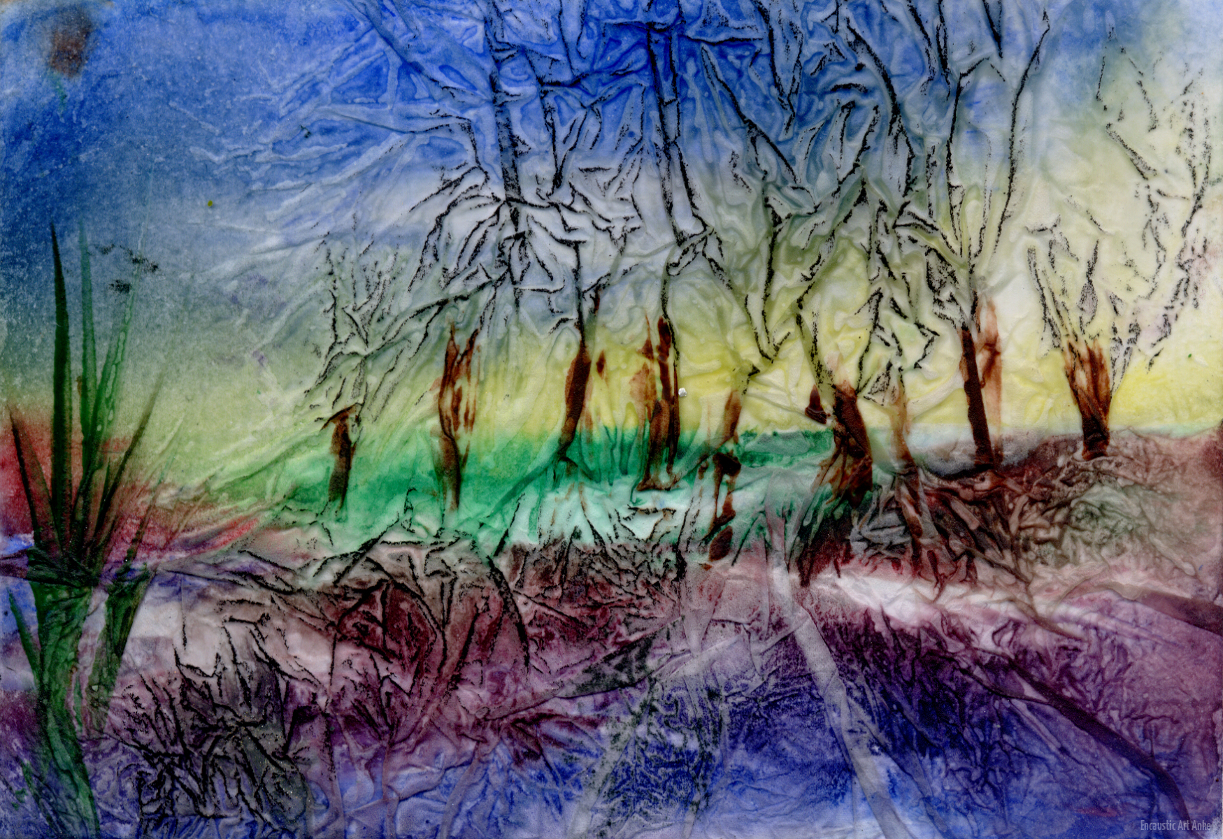 Unter Verwendung von Tissue (z. B. eine Lage einer Papierserviette) usw. lassen sich herrliche Hintergründe gestalten, indem nach einem allgemeinen Farbauftrag mit Klarwachs ein Stück hiervon „aufgeklebt“ wird. Es entstehen zarte, fließende Farbflächen, auf denen mit direktem Malen das weitere Bild gestaltet werden kann. Wird die Auflage geknüllt und wieder lose aufgezogen auf den Untergrund aufgebügelt, entstehen hierdurch interessante Effekte.